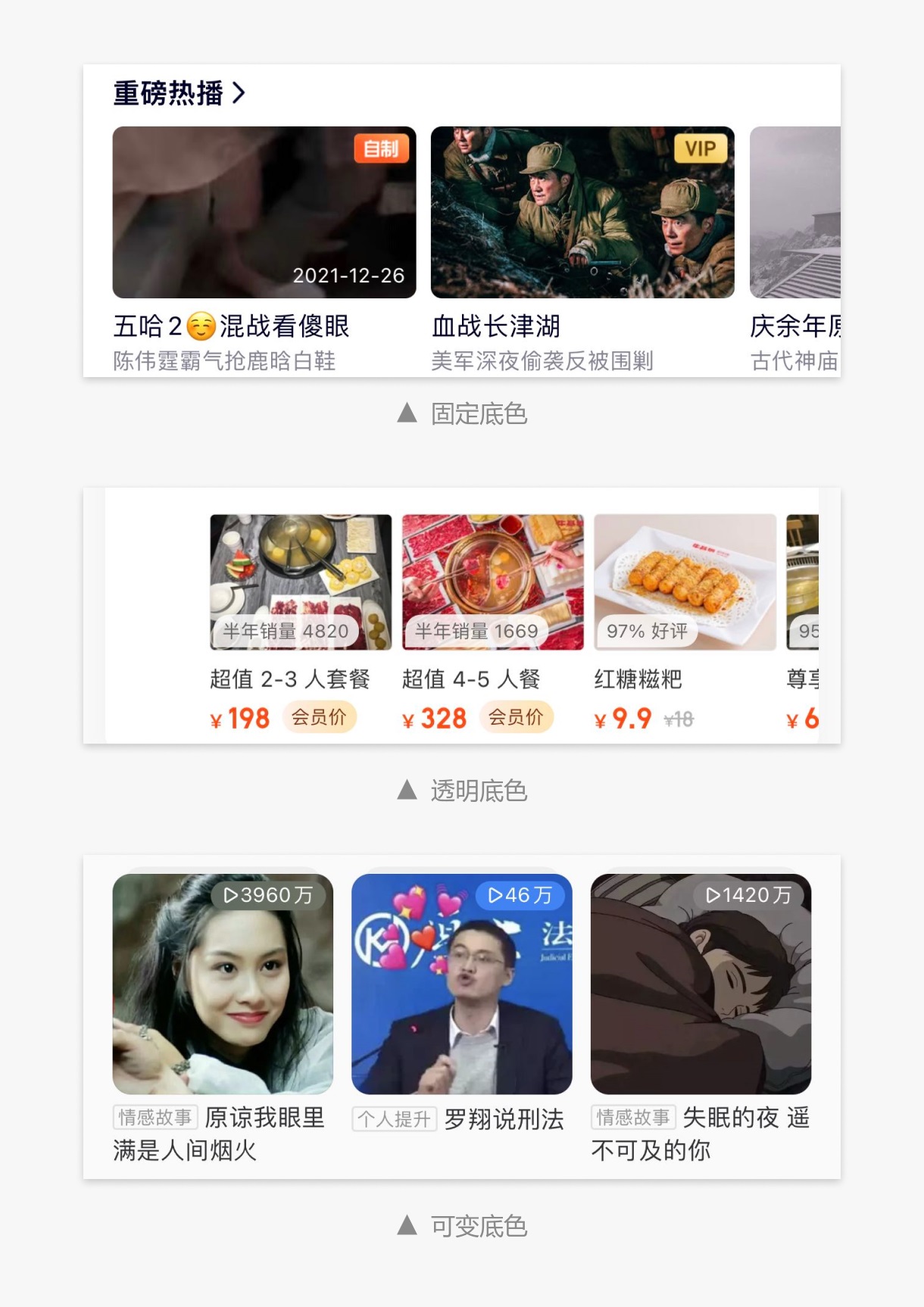 在美团中,标签采用透明底色,信息以销量和好评率为主,作为菜品的辅助信息,更多考虑的是减少对图片造成干扰,辅助标签文本信息的传递。
