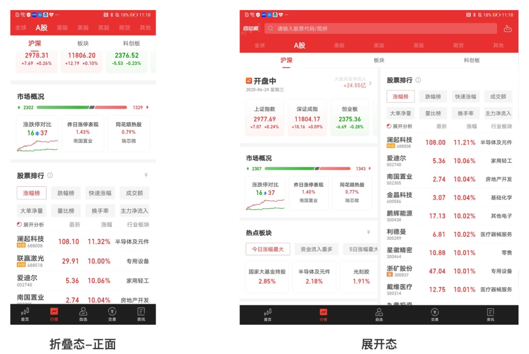 场景化适配时很重要的思考点,比如同花顺首页的单屏幕和展开屏幕的视觉空间的内容展现,当单屏显示时红色区域的5个重要模块的入口是以icon的形式展现,而当画面足够大之后,很好的把icon转换成了走势图,提高了用户的识别效率;当折叠屏显示区域足够大之后包括「股票开户」等入口和Tab切换位置区域可以更多的在一屏展现出来,有效的利用了折叠屏的大屏优势。