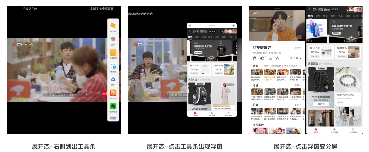 在华为的屏幕右侧隐藏着一个快捷调用的Bar,能够在你沉浸式体验的时候,「从右侧边距向左滑动出现」快捷入口,它可以以浮窗的形式出现在屏幕最上方,也可以拖动快捷入口中的应用和现有屏幕形成双屏显示,比如你在看你喜爱的综艺节目时,你还想和你的朋友聊天不退出全屏,这个时候用起来是很爽的交互;场景二是当你在看视频时,还有逛逛天猫这个时候,折叠屏的优势就会显现出来,不会因为屏幕小而被打断
