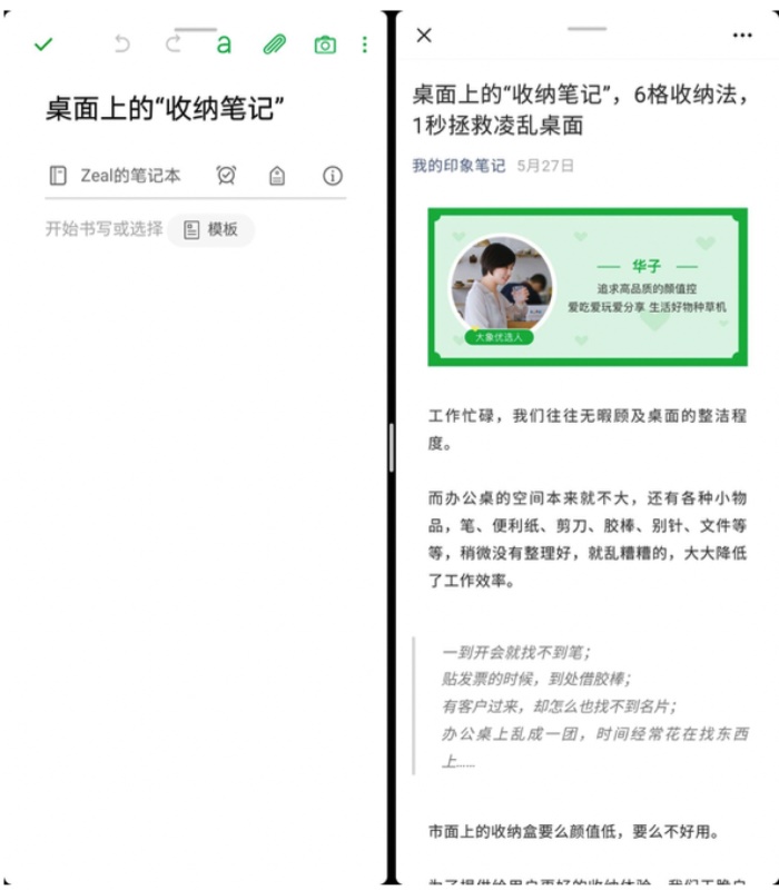 折叠屏能够使得画面分配,这个场景当你在工作和学习的时候,存储和记录变成了一件很高效的事情,你可以一边读文章,一边在你的印象笔记里记录你的知识点: