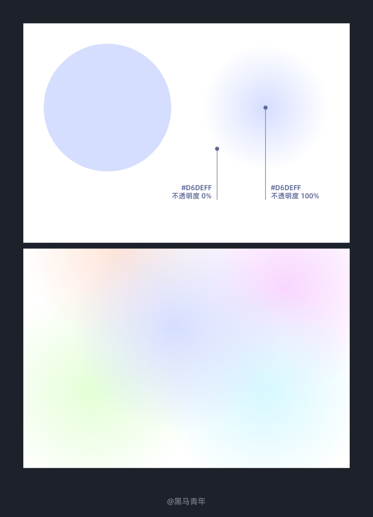 画一个圆形,选择径向渐变,渐变两端的颜色选择同一个色相。然后设置中间颜色不透明度为 100%,另一个颜色不透明度设置为 0%,这里颜色适合选择低饱和度的范围。同样的方法反复绘制几个不同颜色的圆形进行组合,即可完成极光风背景设计。