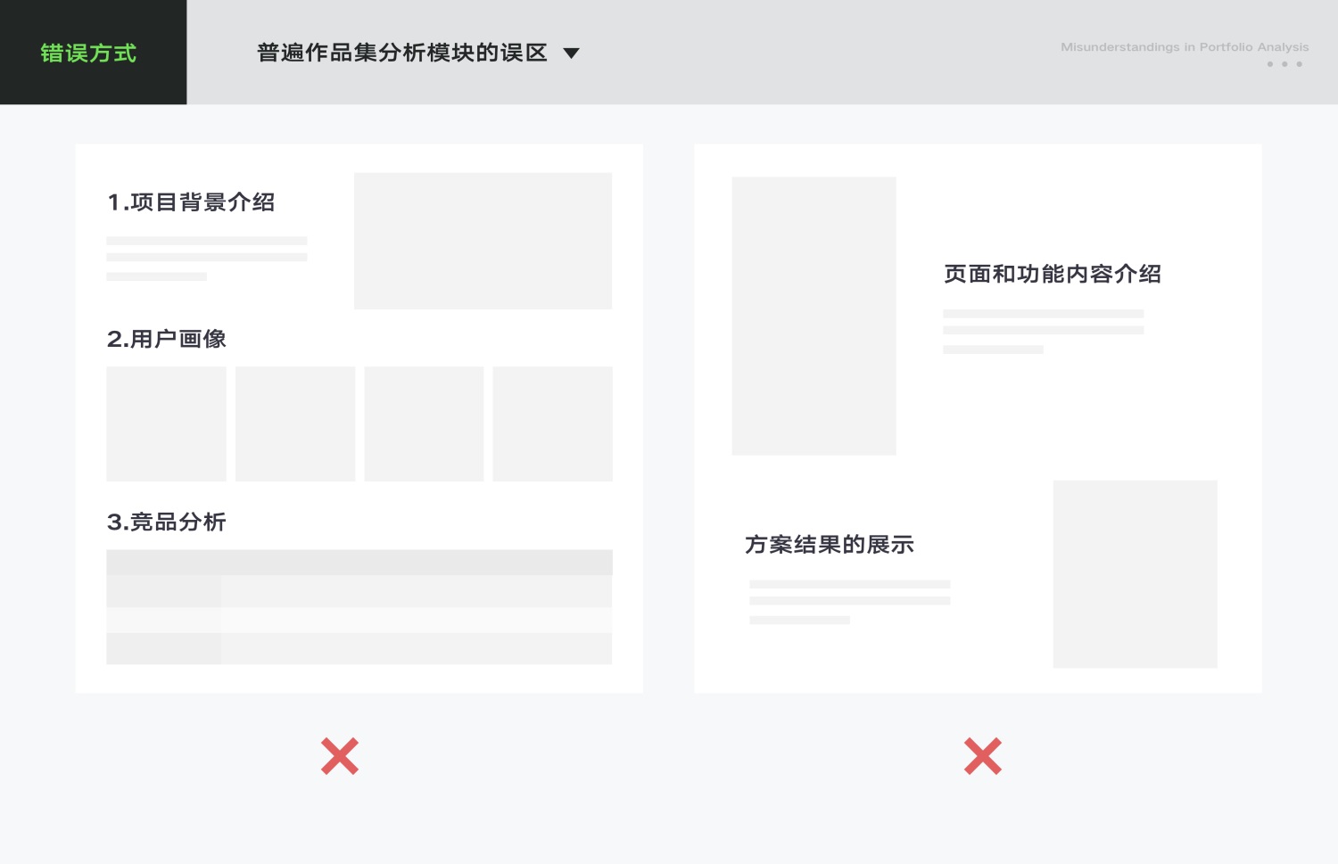 通常在做方案的时候,大家也总会用到竞品分析,竞品分析是一把双刃剑,它可以让你的方案至少不会出大错,也可以让你的方案没有特点,所以这也很考验设计师是怎么将产品业务的定位、用户属性、业务目标的差异化结合到方案中去的。竞品分析大家也很喜欢单独拿出一个板块放在作品集里,咱先不论有没有真实操作过,放在作品集里的内容,一定要有目的性,大家仔细品一下这句话。你想要通过放这块内容告诉面试官什么?是你拿了一堆竞品做了比较和描述,还是说你能够结合自己业务和用户的特性,找到和其他竞品设计差异化的点,最后应用或指导到你的设计方案中去?