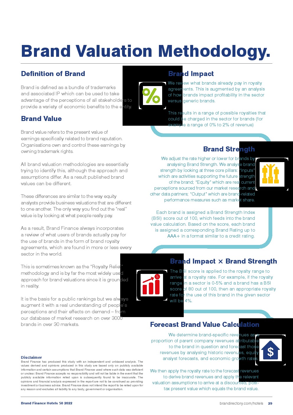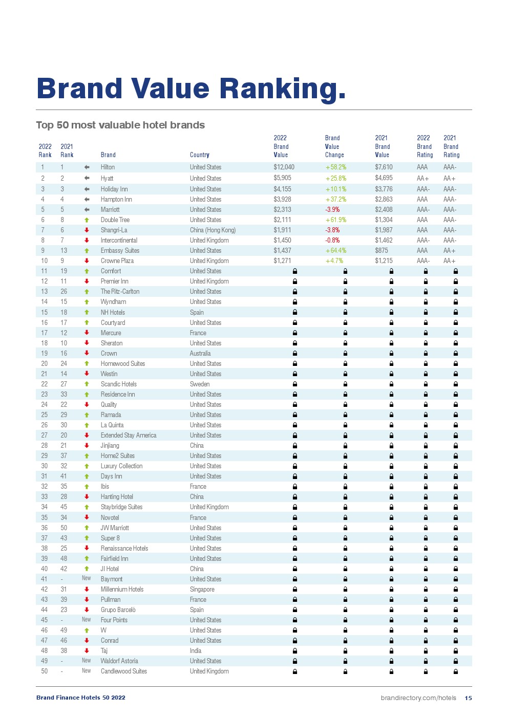 展望大流行后的世界时,希尔顿的品牌价值增长是由预测收入的增加和盈利预期的增加共同推动的。与此同时,Brand Finance 研究发现,顾客对希尔顿的看法有所改善,而大品牌在安全问题上的可靠性和可信度是一个关键因素。这使其品牌实力指数从80.8上升到88,将其品牌评级从 AAA- 提升至 AAA。