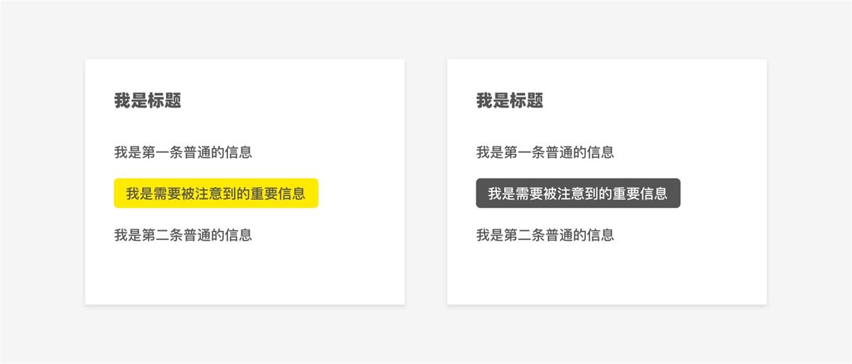 不过,当加入一层淡淡的色块充当文字背景后,便可以制造出极为明朗的层次关系。一方面,这段文字神奇得与其他信息迅速孤立开来,另外,有面作为"靠山"让它变得稍微与众不同,并且相比其他文字能被更快得注意到。
