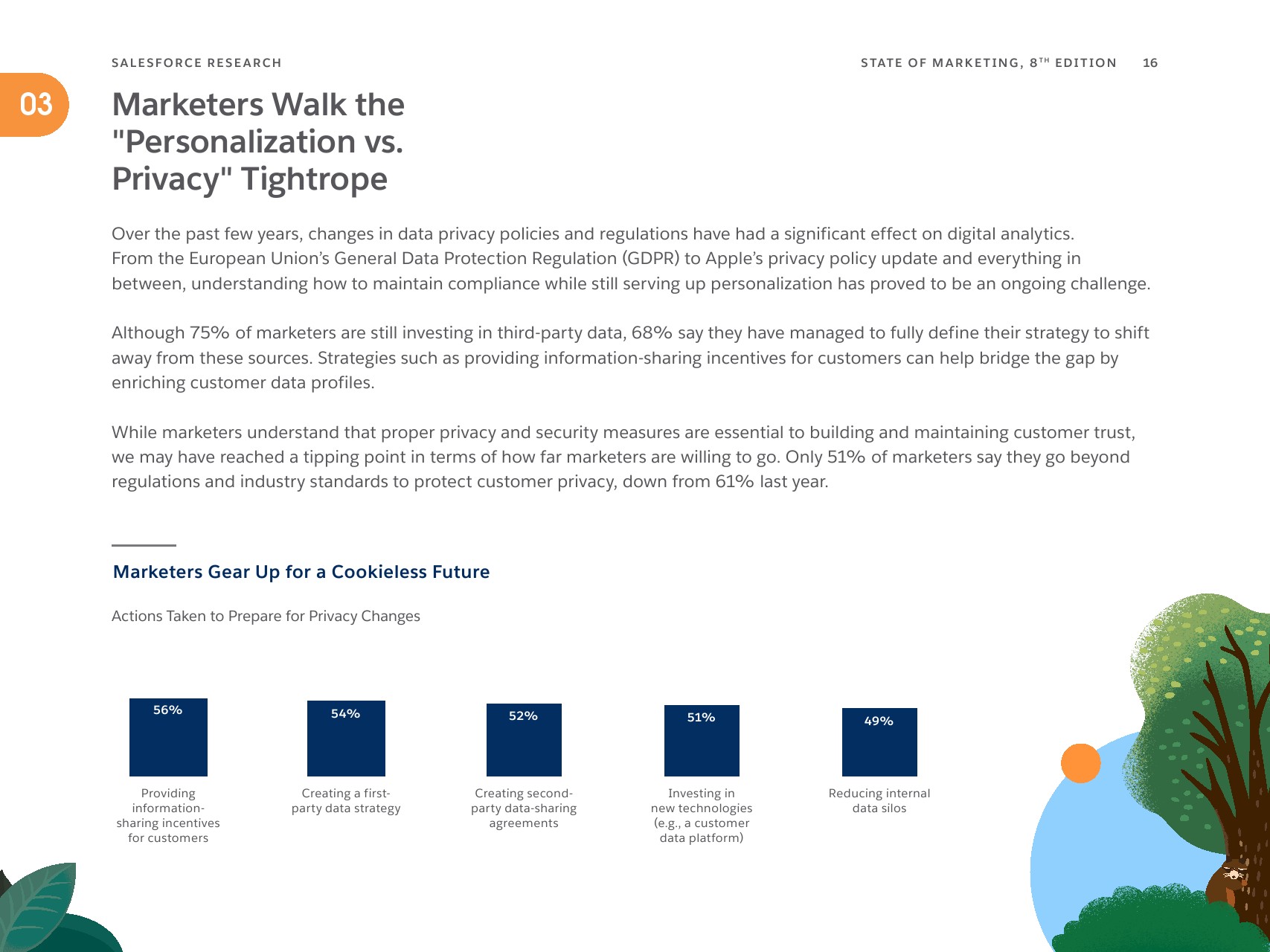 营销人员在"个性化与隐私"之间走钢丝,他们正在适应隐私法规的变化和对数据透明度的要求。 随着第三方 Cookie 的终结,68% 的营销人员有一个完全明确的策略来转向第一方数据。