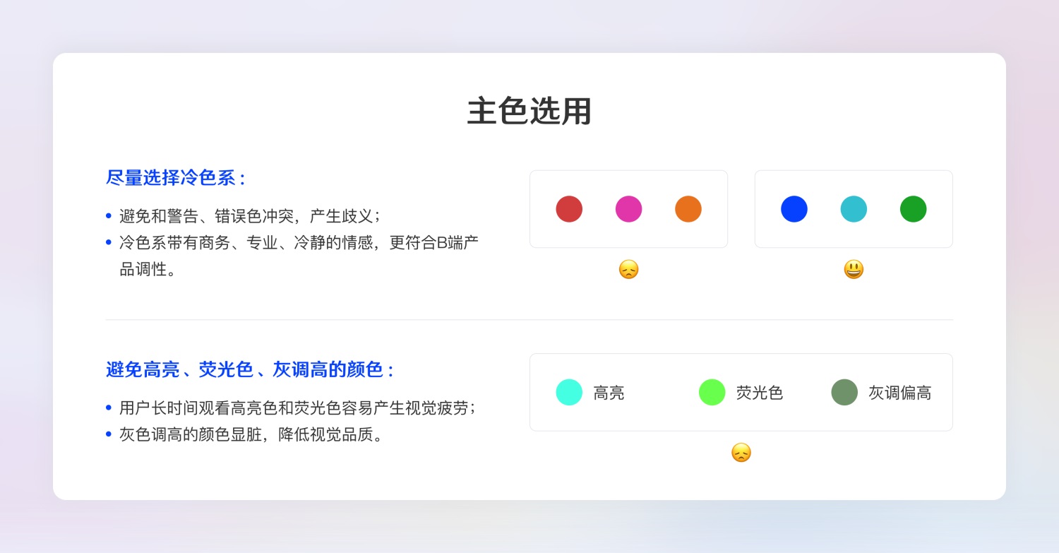 同时主色选取应避免高亮、荧光色、灰调高的颜色。