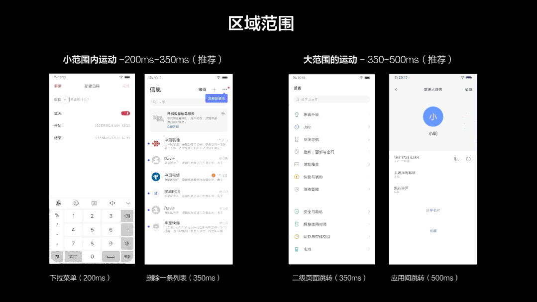小于 200ms 的动效不易被感知,多于 1000ms(1s)则让用户感到缓慢,交互动效时长一般在 200ms-500ms 之间,我们在设计时长时,可以从以下几个因素进行考虑: