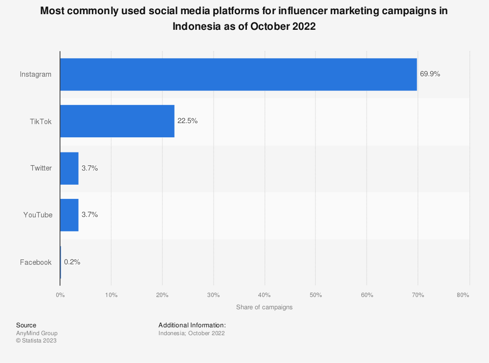 然而,印尼品牌在考虑与哪些网红合作时也有自己的衡量标准。其中一些指标包括不同社交媒体平台上的网红认知水平、网红关注率、网红可信度以及网红参与度。这些指标有助于品牌了解哪些影响者最受受众信任。根据最近的一项调查,在印度尼西亚,以绩效为导向的营销活动比以意识为导向的营销活动更常见,占整个营销活动的57%。虽然Facebook、Instagram和YouTube被认为是印尼网红最喜欢的平台,但Instagram是网红营销活动使用最多的社交媒体平台。