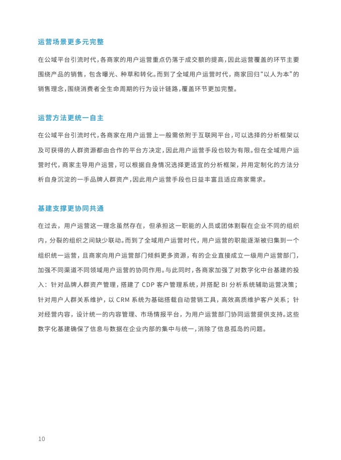 白皮书结合伽蓝集团、名创优品、安奈儿、香港莎莎等企业案例,展示了恰当的用户运营团队、适配的组织架构以及强有力的数字化基建对在深度挖掘用户价值的重要意义。立志于开展精细化用户运营的商家,要朝着统一运营式的组织构架不断演进,并应用生态产品,加速数字化变革。