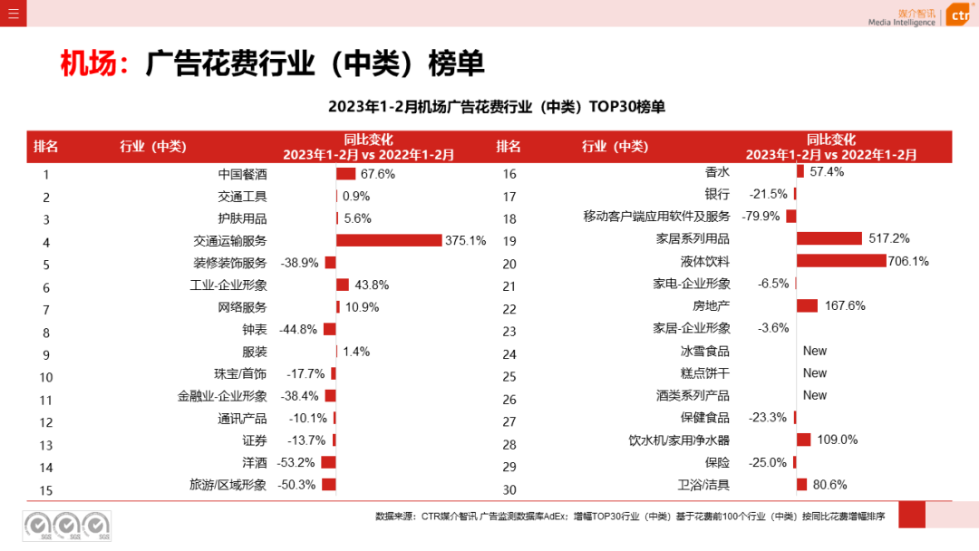 重点行业方面,2023年1-2月饮料、食品、交通、邮电通讯、化妆品/浴室用品等多个行业的户外广告投放量大且花费同比涨幅均达两位数。其中,饮料行业在多个户外广告渠道呈现广告花费上扬,特别在电梯LCD、影院视频、火车/高铁站和机场增投表现突出,广告花费同比分别增长60.9%、80.9%、91.8%和62.6%。特殊用途饮料和果蔬汁两个品类的户外广告量超十倍增长,是助推饮料行业广告花费增长的主因,代表品牌包括外星人、天地壹号、健力宝、福兰农庄、山楂树下等,后两个品牌是今年新增投放户外广告渠道,集中在电梯场景投放宣传。