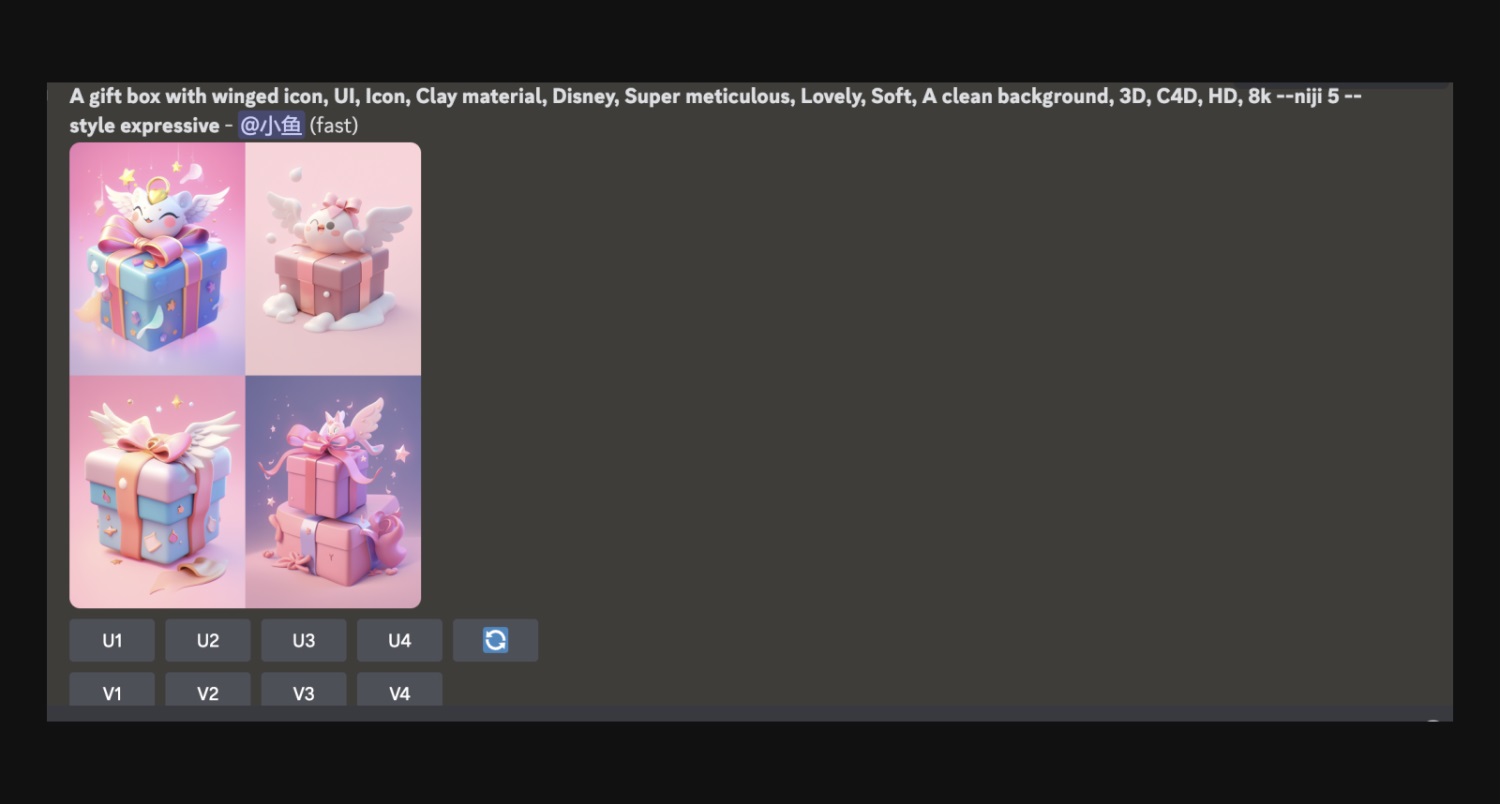 U1-U4 对应四张图,可以选择自己满意的图进行放大,如果不满意可以使用 V 指令,针对某一张图在进行生成