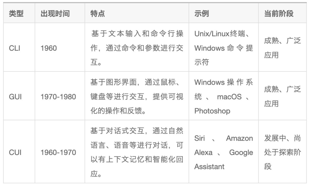 CLI 作为最早的用户界面形式,在 1960 年代就已经出现并得到广泛应用,而 GUI 则在 1970 年代至 1980 年代得到较为广泛的发展和应用。而 CUI 则相对较新,近年来随着人工智能技术的发展,尤其是自然语言处理和语音识别技术的进步,CUI 得到了越来越多的关注和应用,但目前仍处于发展中,并在不同的应用领域和场景中进行探索和实践。