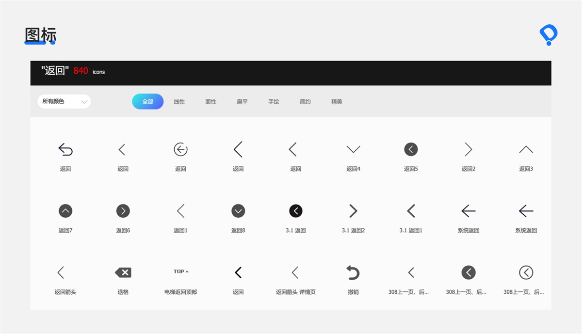 图形标签在页面设计中,作为文字标签的补充,会更形象的传达信息。主要应用的地方的是图标。图形的使用也是要易于理解,不要让形式凌驾于功能之上,不能给用户带来思考成本。在 Iconfont 上搜索“返回”,检索的结果都是相似的箭头,即使有设计师会做一些样式调整,但是都离不开箭头这个符号,因为这已经形成了深刻的用户心智。