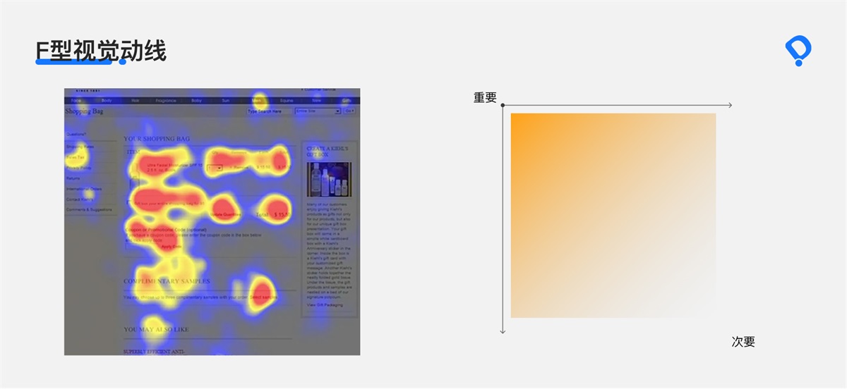 F 型视觉动线模型是尼尔森于 2006 年提出的,模型中指出,用户常用习惯方式是:扫描。在信息浏览过程中,遵循最省力的路径来浏览内容,直至找到想要的信息,因此前几行左侧内容看得多,而右侧内容和页面靠后部分便看得少,通常情况下便形成大体的 F 型。