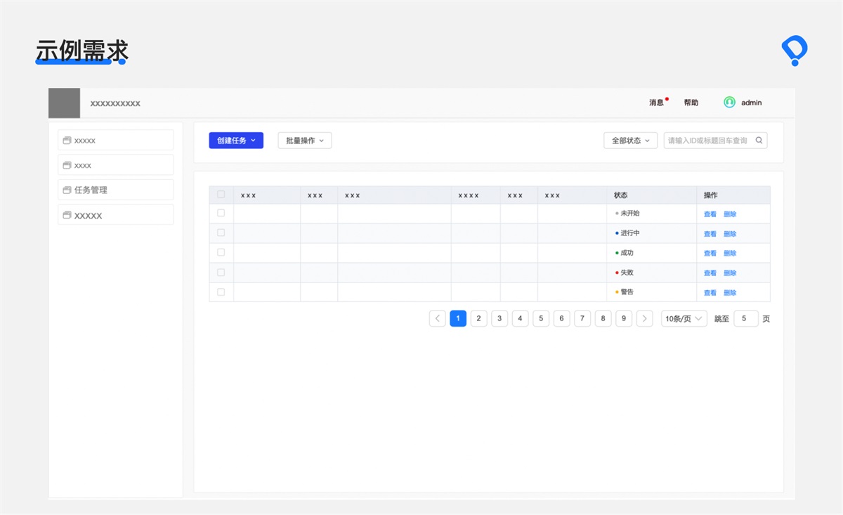 以上图所展示的简单需求为例。从当前页面中我们可以看到,这是一个任务管理的模块页面。在任务管理中,要支持用户创建三类任务,创建结束后还要支持信息的浏览、查找和编辑。而这些信息的来源就是上面我们分析的业务场景,这只是经过整理之后的。