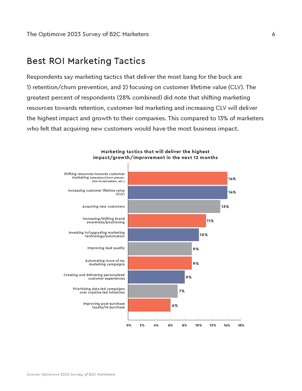 根据Optimove的一项调查,54%的B2C营销人员表示,他们在用户获取上的预算高于留存率,而33%的人在用户获取和留存率上的预算相同。受访者对明年实现最高增长的最佳方式存在分歧,一些人倾向于将预算转向客户营销,而另一些人则希望将重点放在新客户获取上。