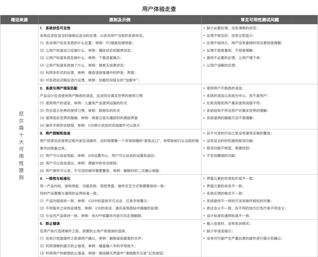 尼尔森可用性原则是通过分析了 200 多条可用性问题总结出的原则,目前被广泛应用于设计方案的检验与评估。此外我们还可以将尼尔森可用性原则作为设计内部体验走查的标准,帮助我们发现产品中更多的体验问题,例如在 vivo 互联网设计团队内部就依据尼尔森可用性原则输出了设计走查的标准。