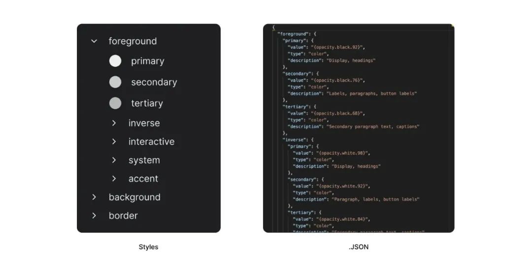 上图左侧是样式的示例。"foreground.primary"或"foreground/primary"表示在前景文件夹中创建了一个主要样式。
