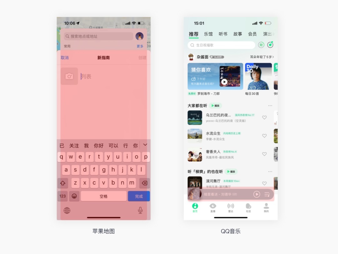 层叠,意思是层层重叠。在 UI 界面中,即多个界面同时重叠在一起来解决用户的某个需求。iPhone 手机中地图新指南添加,QQ 音乐中播放器常驻在页面底部均是利用层叠的设计思路对功能做出设计,避免操作层级太深,提升用户的使用体验。