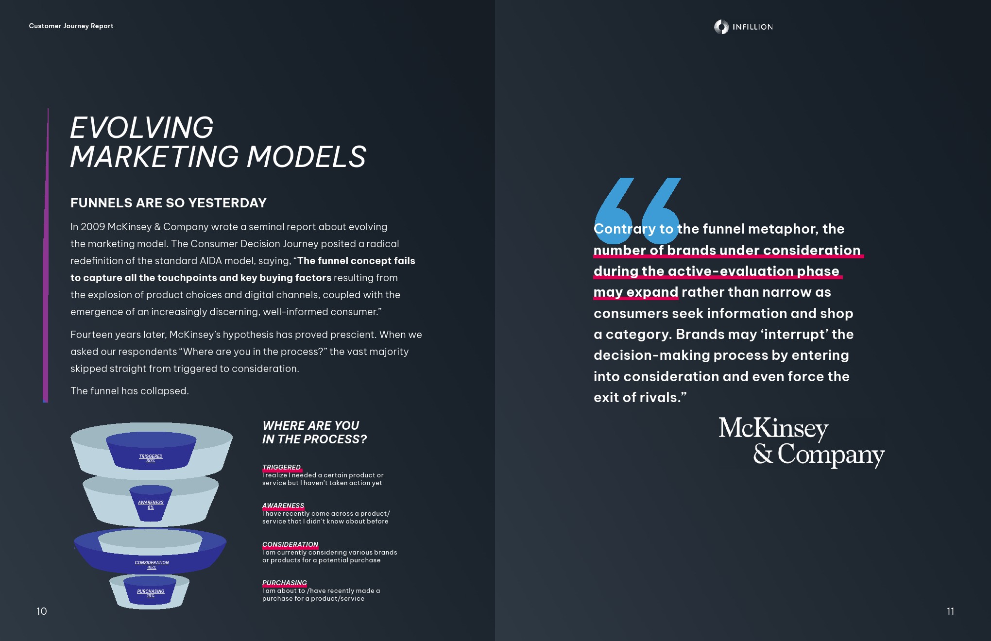 大大小小的公司现在都在争先恐后地跟上消费者行为的快速变化。埃森哲最近对B2B和B2C高管进行的一项研究显示,95%的高管表示:“客户变化的速度比他们改变业务的速度要快。”Digiday和亚马逊的一份报告发现,消费者习惯的持续变化,加上数字渠道的不断发展,要求营销团队进行创新,跟上受众的步伐。为了更好地服务客户和合作伙伴,Infillion开始量化这些消费者习惯的变化。具体来说,今天的营销渠道和消费者旅程是什么样子的。客户在不同阶段使用哪些触点?他们在看流媒体电视、做产品研究或查收邮件时是否有偏爱的设备?他们还在店内购物吗?什么渠道或触点对他们的考虑和购买影响最大?