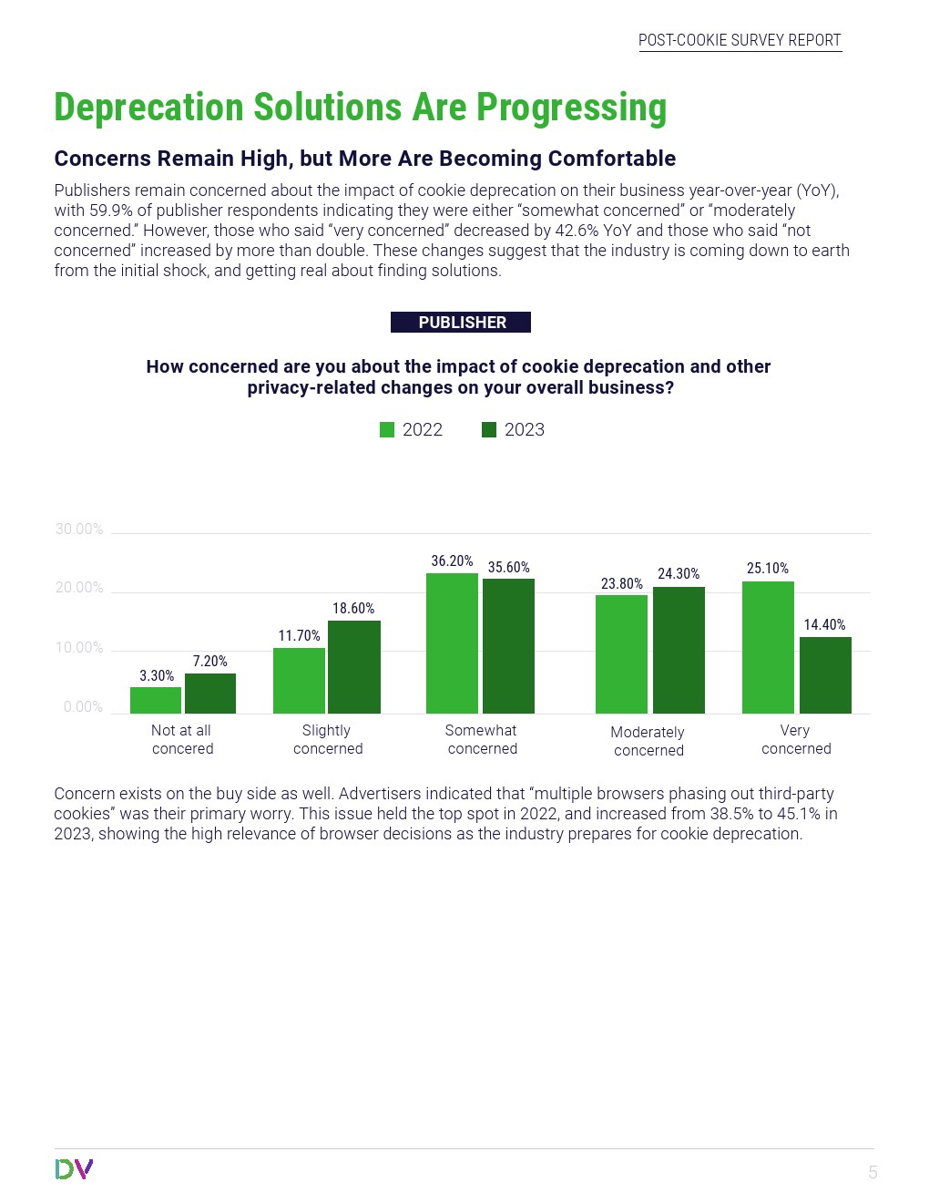 发布商仍然担心Cookie弃用和其他与隐私相关的变化对他们整体业务的影响,尽管他们的担忧程度自去年以来有所减弱。广告业为cookie的废弃做准备,广告主们也表达了他们的担忧,这个问题在调查中占据了首位。