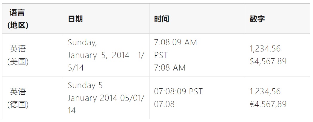 值得注意的是,使用相同语言的用户不一定会使用相同的数据格式。例如:一个生活在德国的以英语为母语的用户,可能会选择英语作为语言,选择德国作为地区。