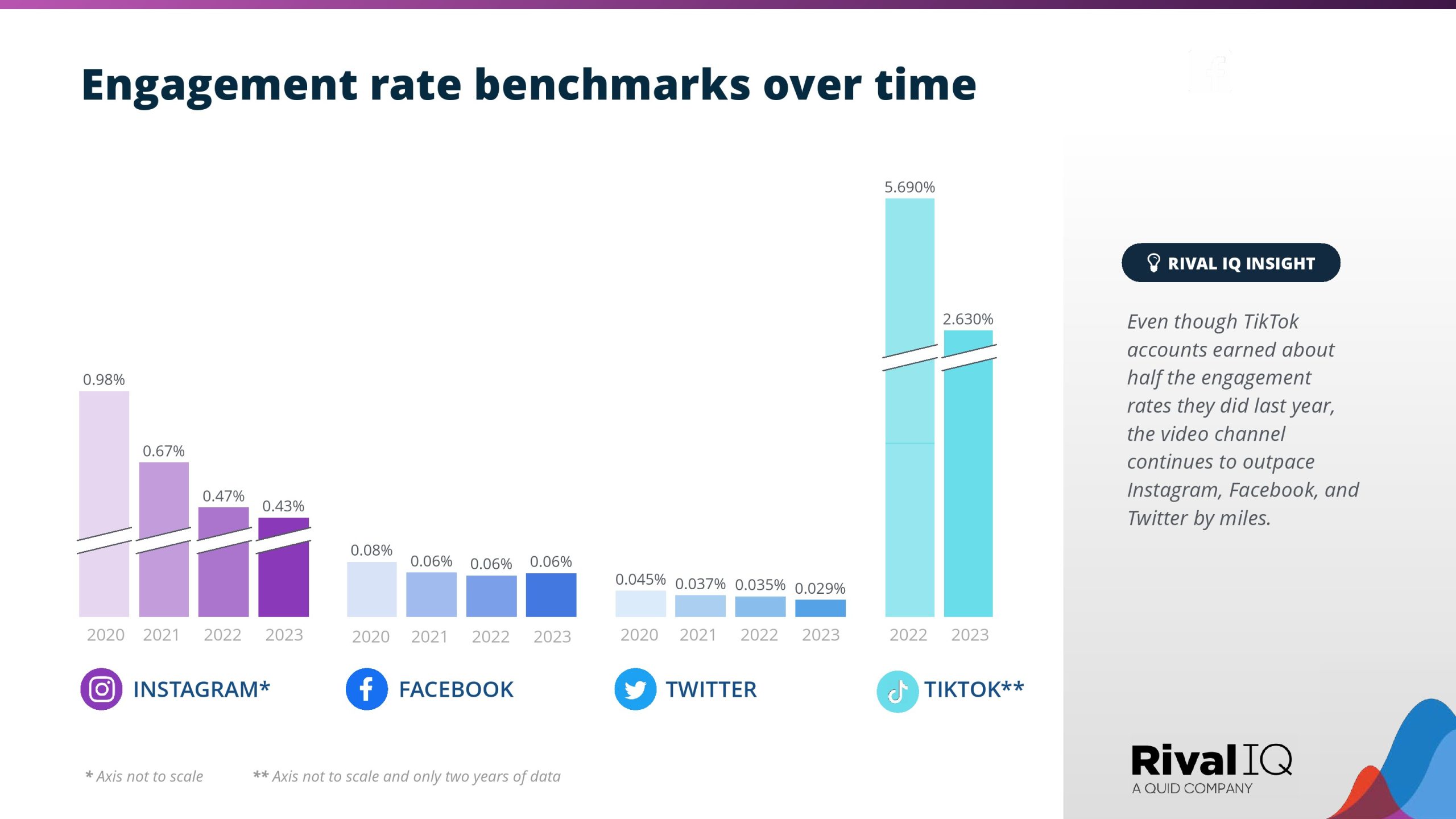 RivalIQ发布了“2024年社交媒体行业基准报告”。各大品牌今年的参与度略有下降。TikTok的用户参与度下降了50%左右,但Facebook的用户参与度实际上有所增长,所以也不全是坏事。