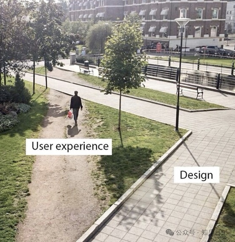 这是我在网上找的一张图——这是一个公园的场景,设计师规划了用户行走的路径,可是,在用户真正行走的过程中,并没有按照设计师原本规划的路径来,而是自己开辟了一条小道,这是为什么呢?我想,一个很重要原因就是:设计师原先的设计,不符合用户模式。