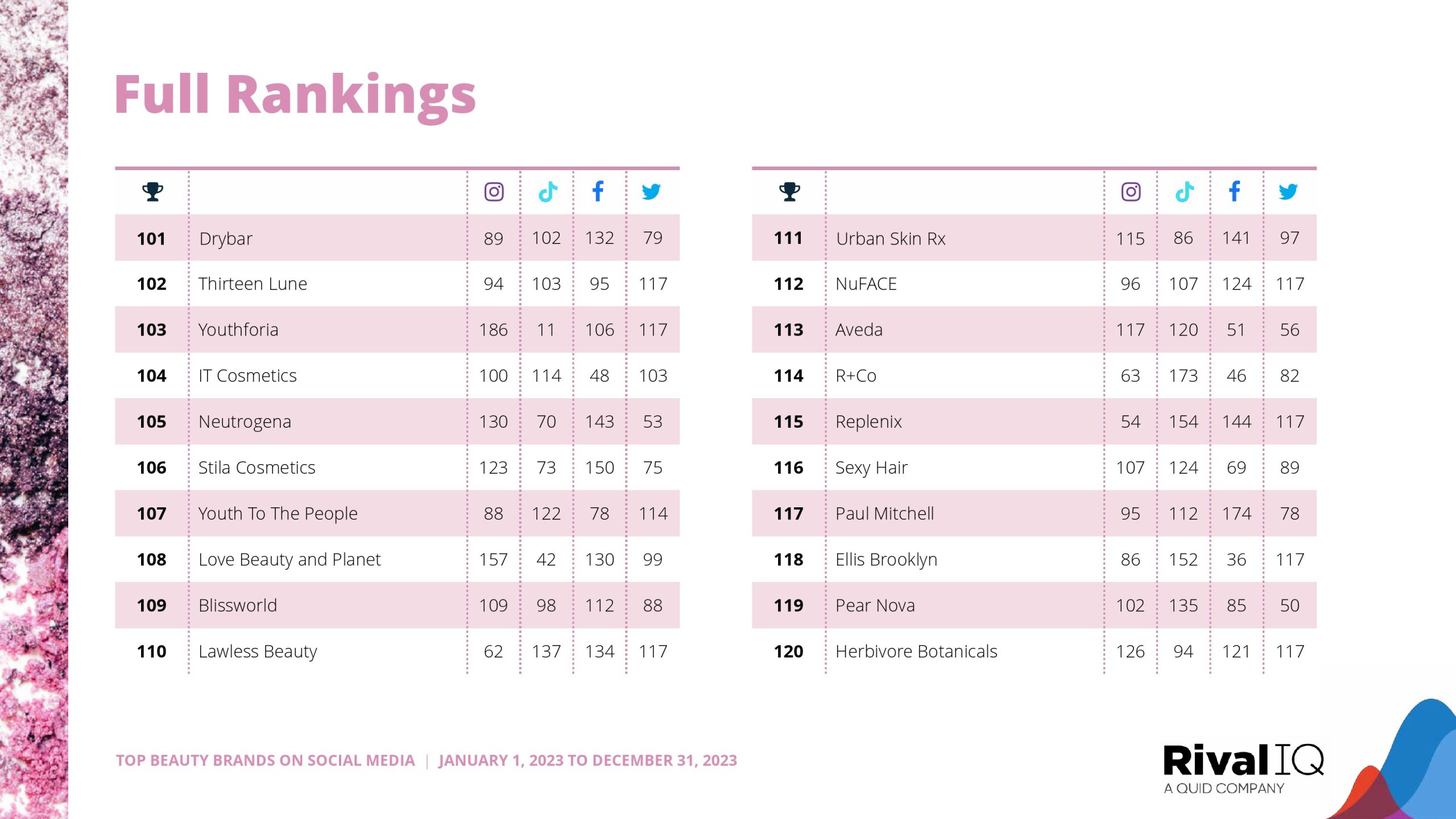 Rare Beauty在去年获得第二名后,今年摘得TikTok的金牌。2023年TikTok冠军Kylie Cosmetics今年没有进入前十,但Fenty Beauty、Huda Beauty、Sol de Janeiro和LANEIGE今年都成功地再次取得了强劲的成绩。