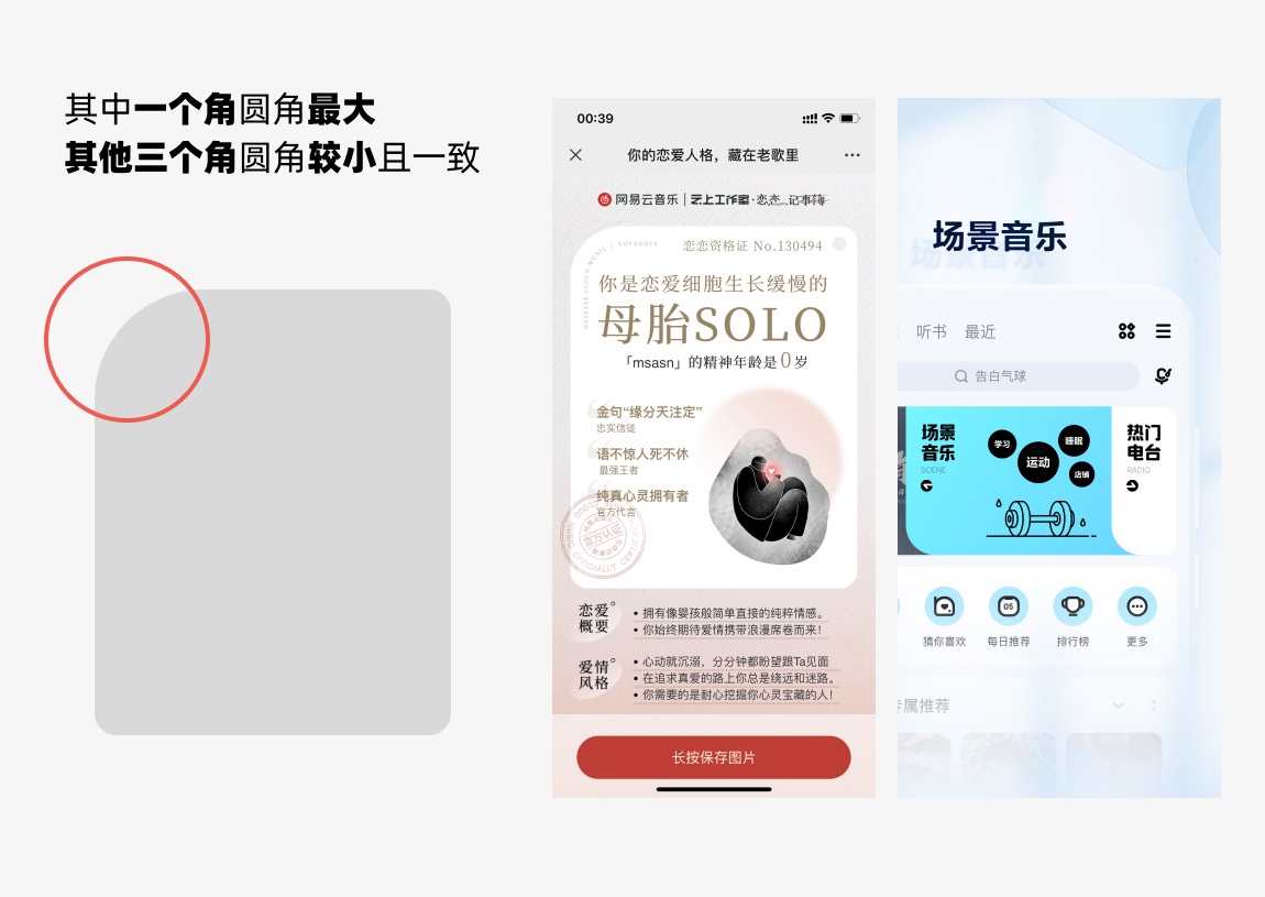 2. 缺角不一:其实就是矩形卡片的四个角圆角大小不一,呈现出来的效果,去丰富设计细节
