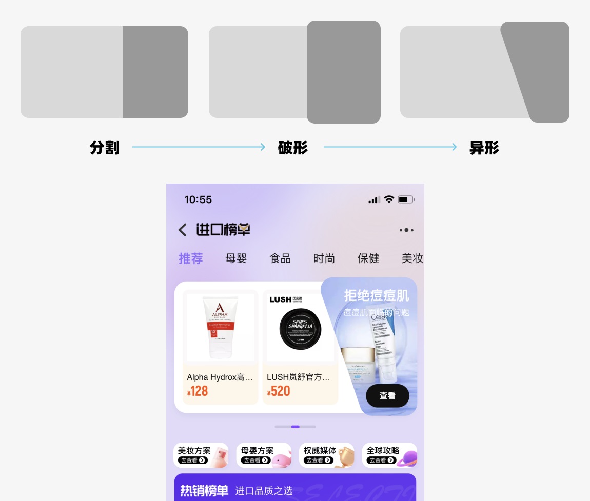 2. 图形破界:在卡片的基础上再叠一个图形破出,这个图形能够帮助你承载一些信息内容,丰富设计形式。