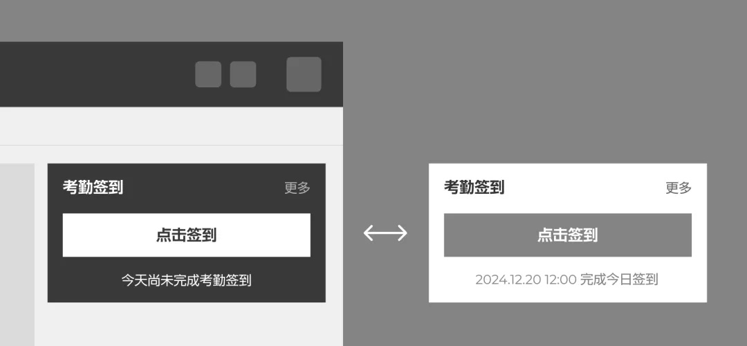 先从系统部分说起,因为签到一天只需要签到一次,所以虽然优先级高,但没必要放在内容区域的左上角,而放在右上角即可。但签到因为权重高,且预防用户忘记点一天班白上,所以未点击状态下视觉需要强化。同时,签到历史可以从该模块移除,和当前的签到操作没有联系的必要,在完成签到后显示签到时间即可。