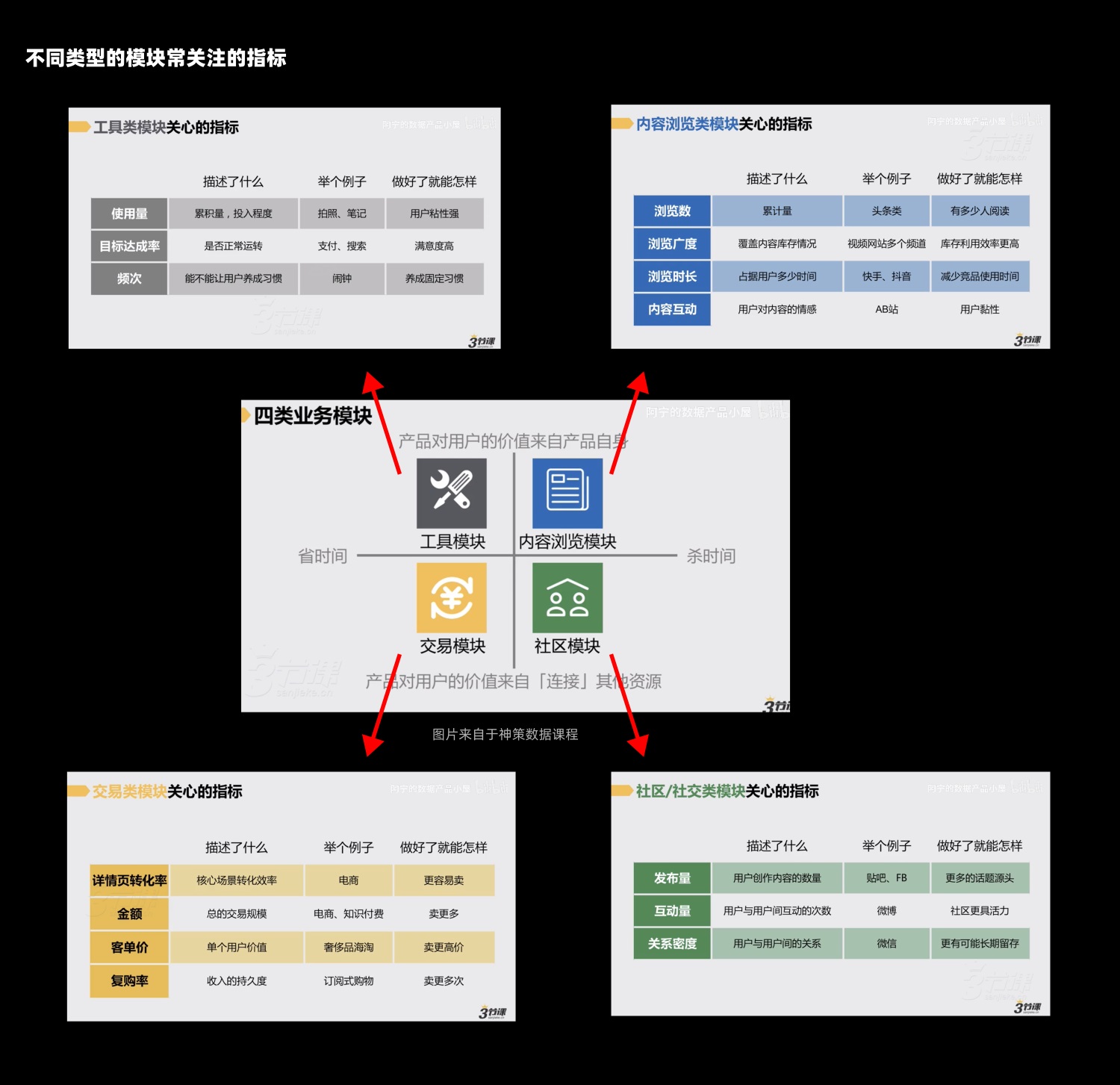 当然除了根据模型知道自己需要看什么数据,也可以根据这次关注的「页面模块」的类型,来判断这种类型的模块通常会关注什么数据,如下图提到的不同类型模块关注的数据指标通常不同。