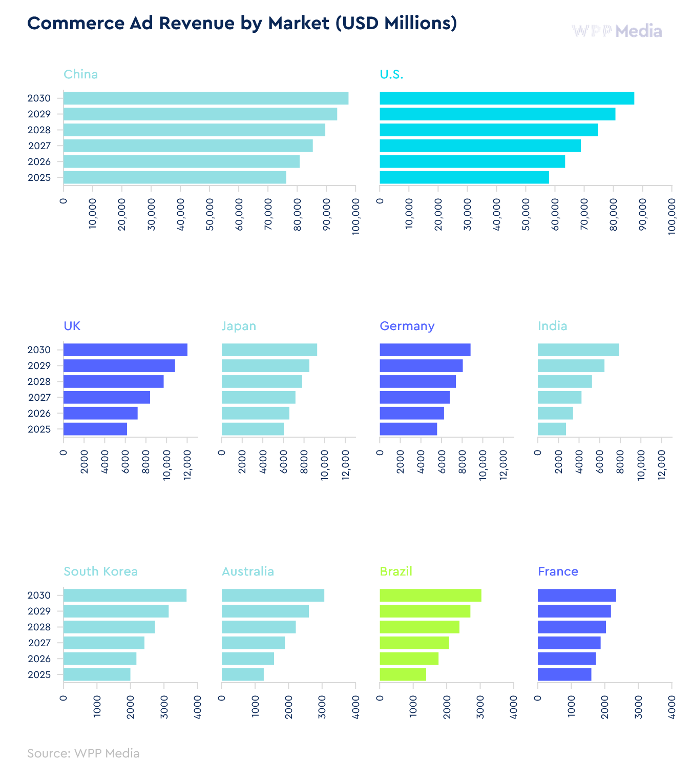 值得注意的是,商业渠道的全球广告收入预计将在2025年达到1782亿美元,历史上首次超过电视广告总收入。在商业渠道内部,由于人工智能界面可能蚕食零售媒体收入,可能会出现整合压力以及加强价值证明的需求。