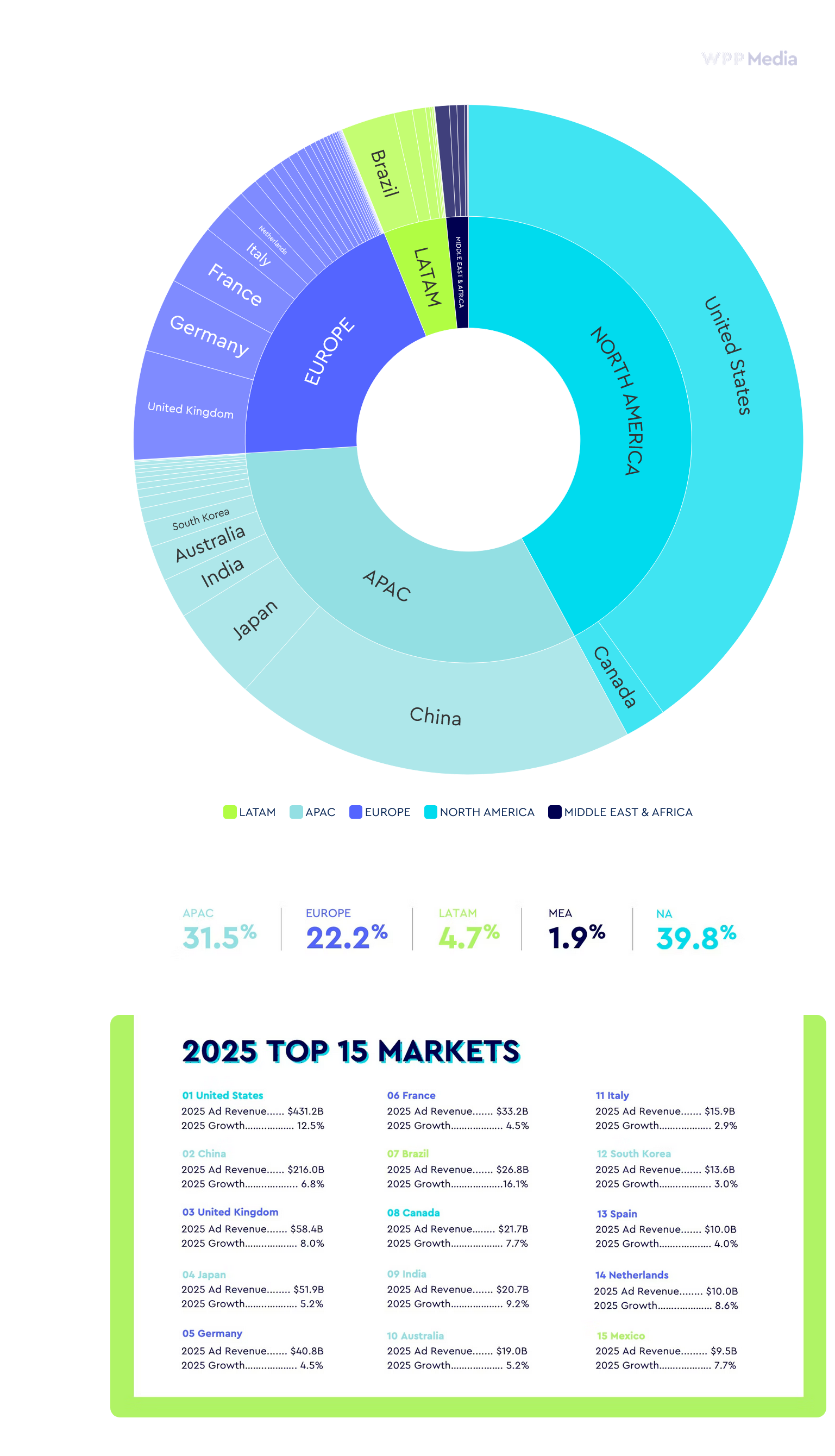 最新预测显示,2025年全球广告收入(不包括美国政治广告)将增长8.8%,达到1.14万亿美元。这一势头预计将持续到2026年,预期增长率为7.1%(不包括美国政治广告)。在一个五年期内,预计复合年增长率(CAGR)将达到6.3%,反映了持续的扩张。