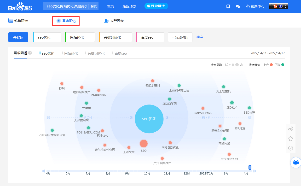 需求分布是综合计算关键词与相关词的相关程度,以及相关词自身的搜索需求大小得出。 相关词距圆心的距离表示相关词相关性强度; 相关词自身大小表示相关词自身搜索指数大小,红色代表搜索指数上升,绿色代表搜索指数下降。